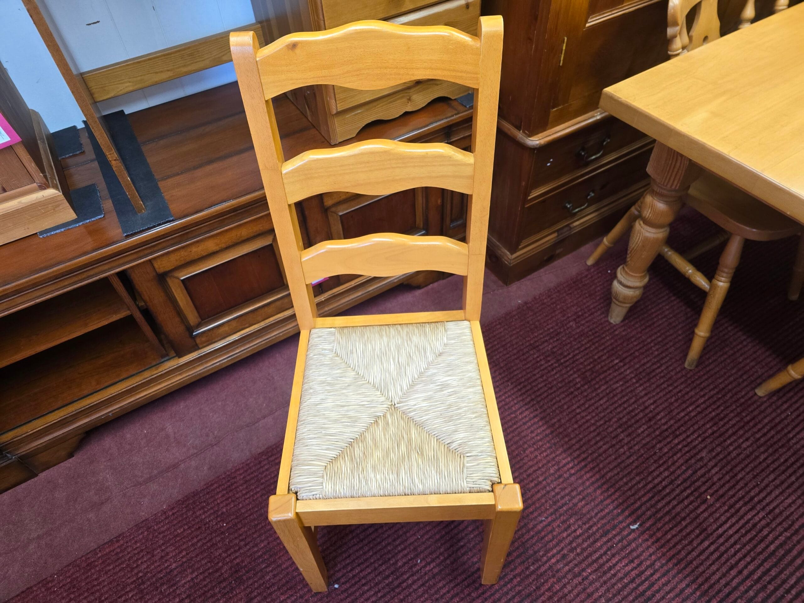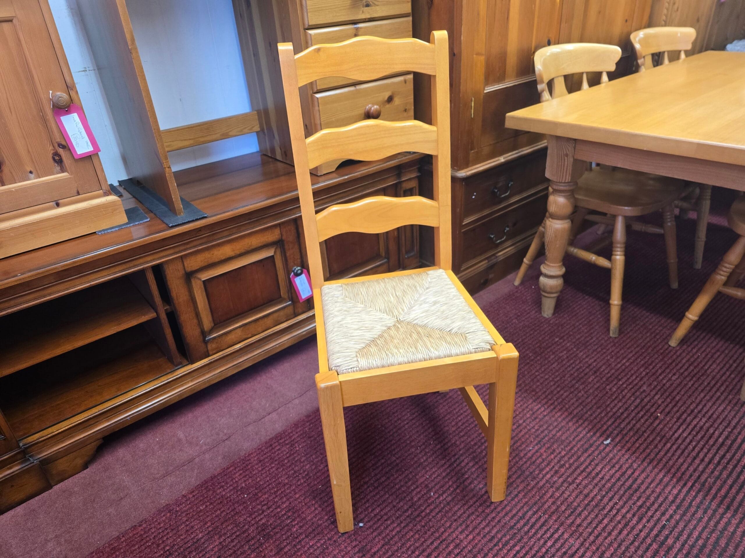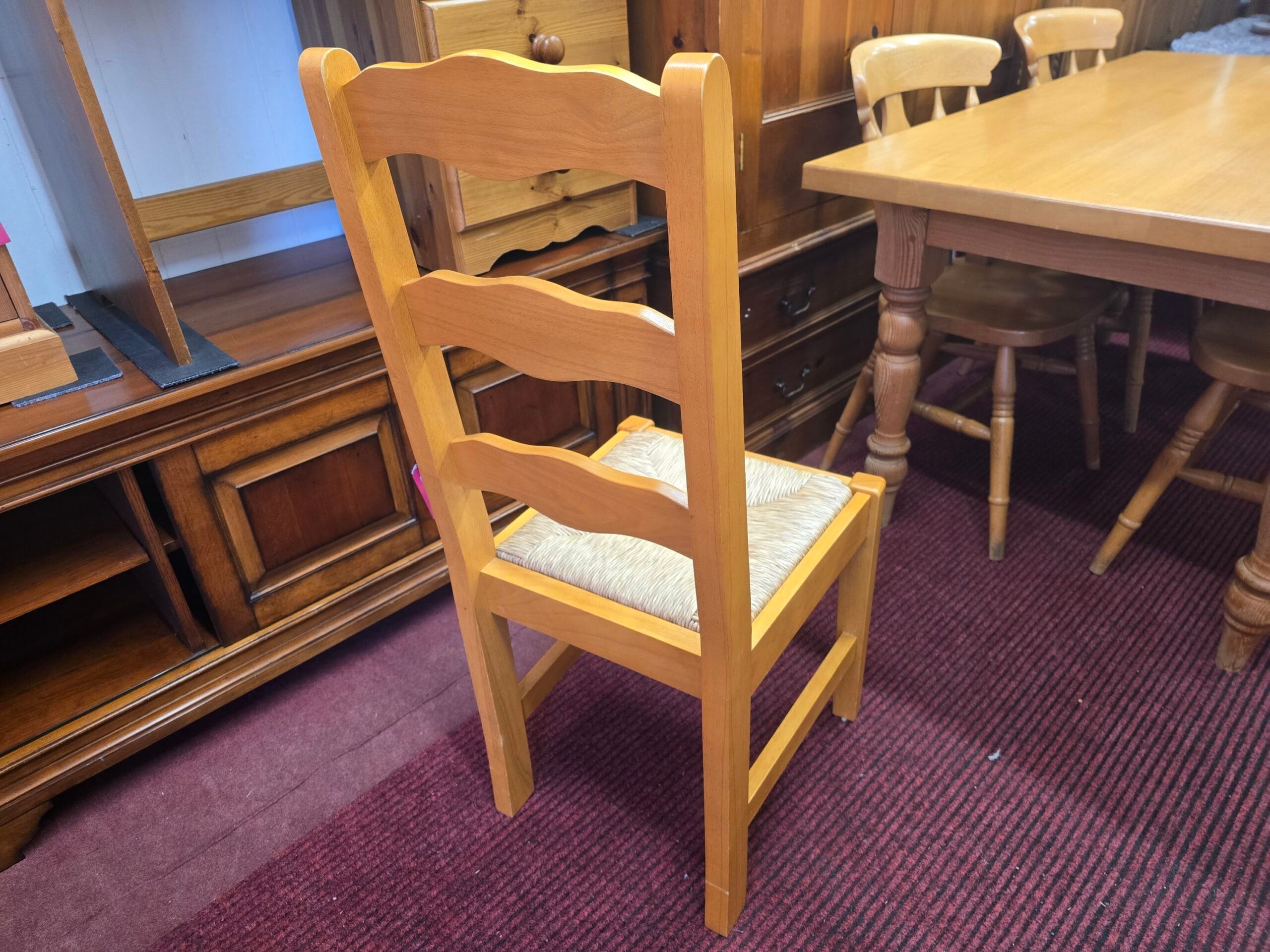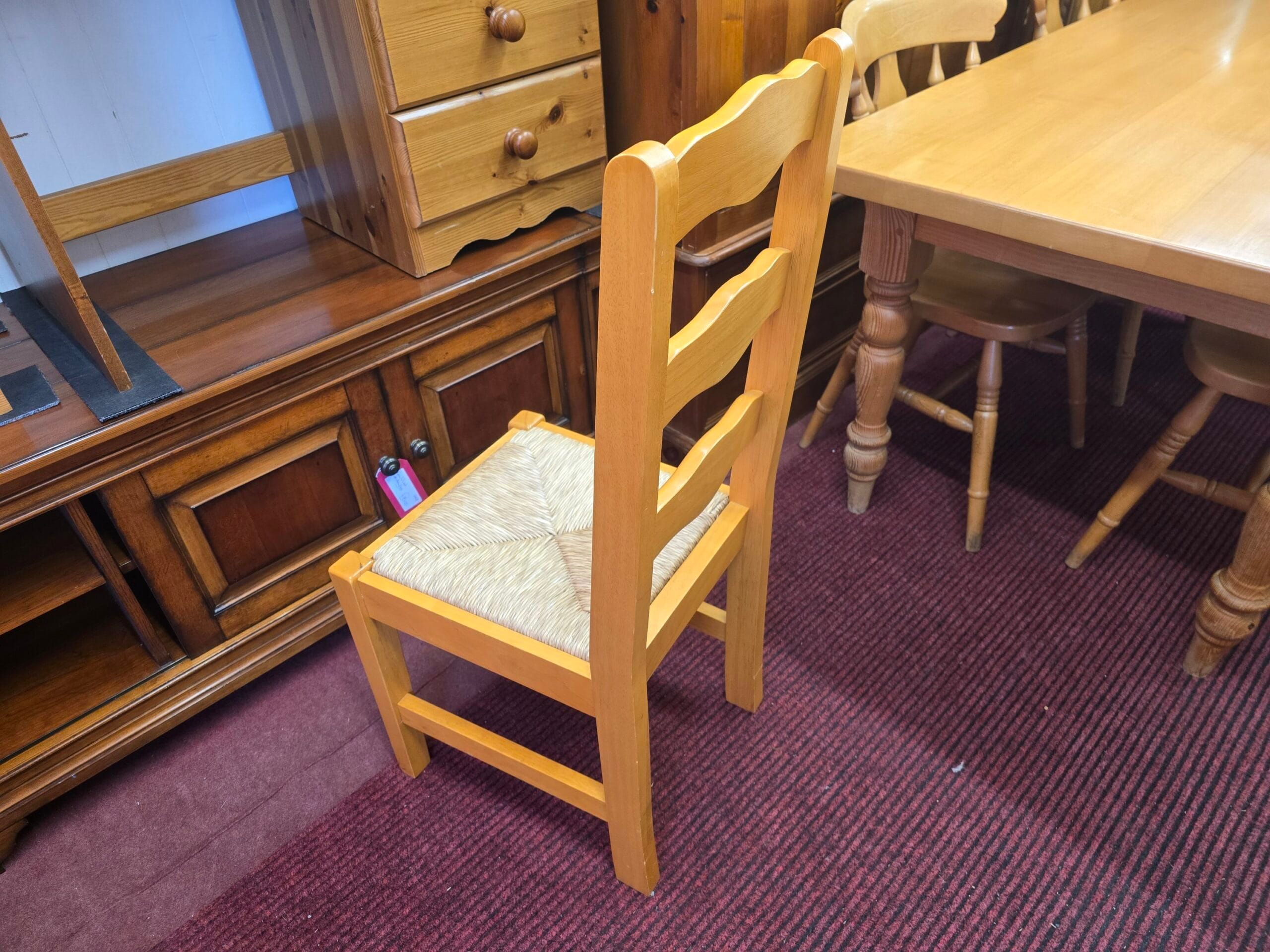 Good Quality Hardwood Table & 4 Ladderback Chairs with Rush Seats. The legs will detach from the top for transportation and ease of getting it into your home.