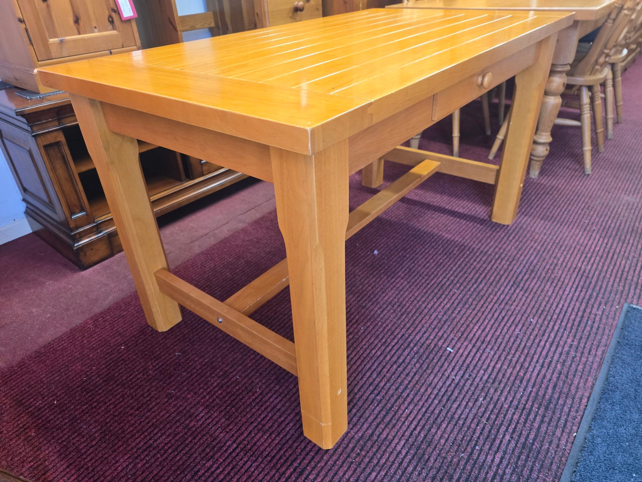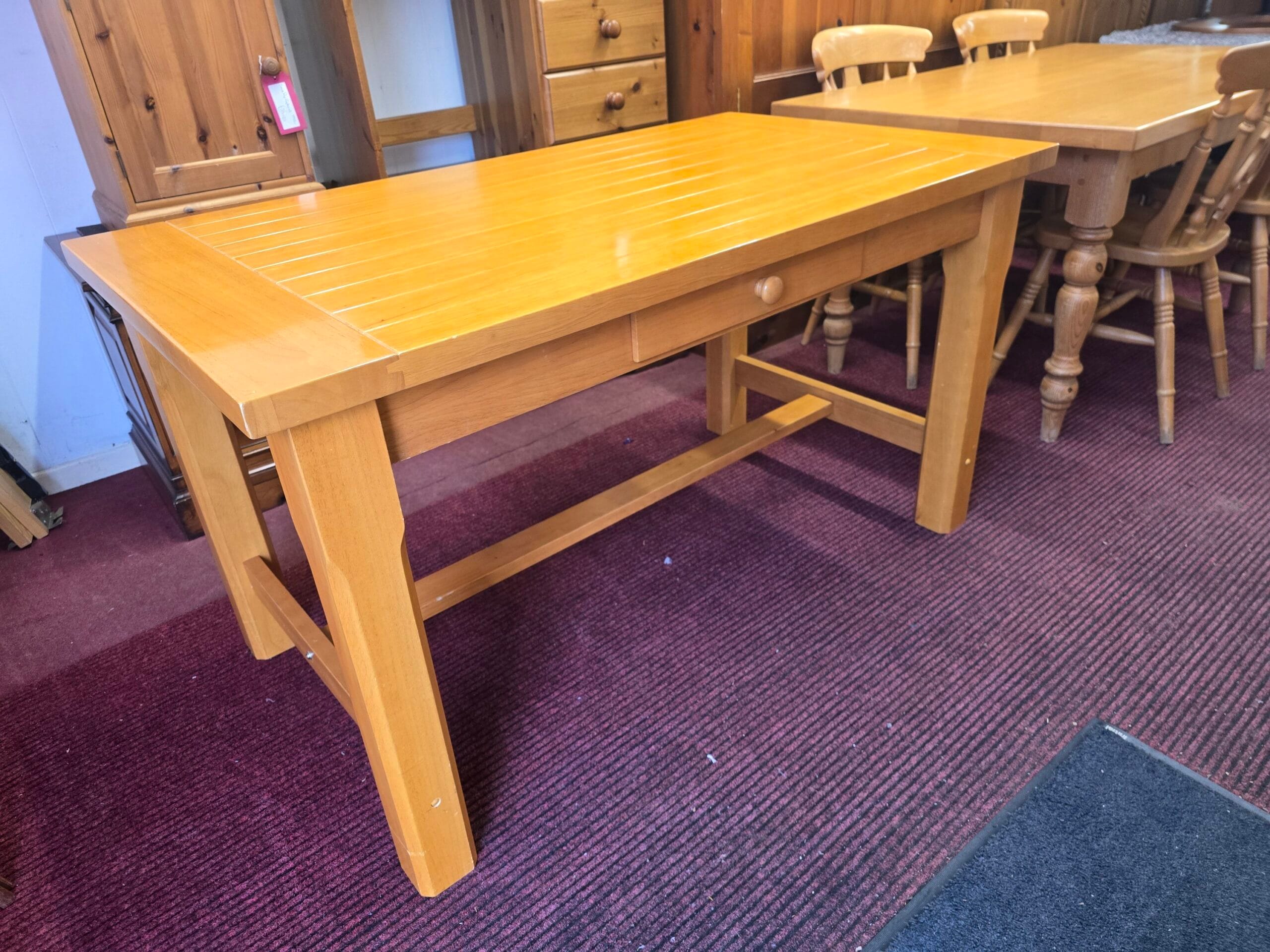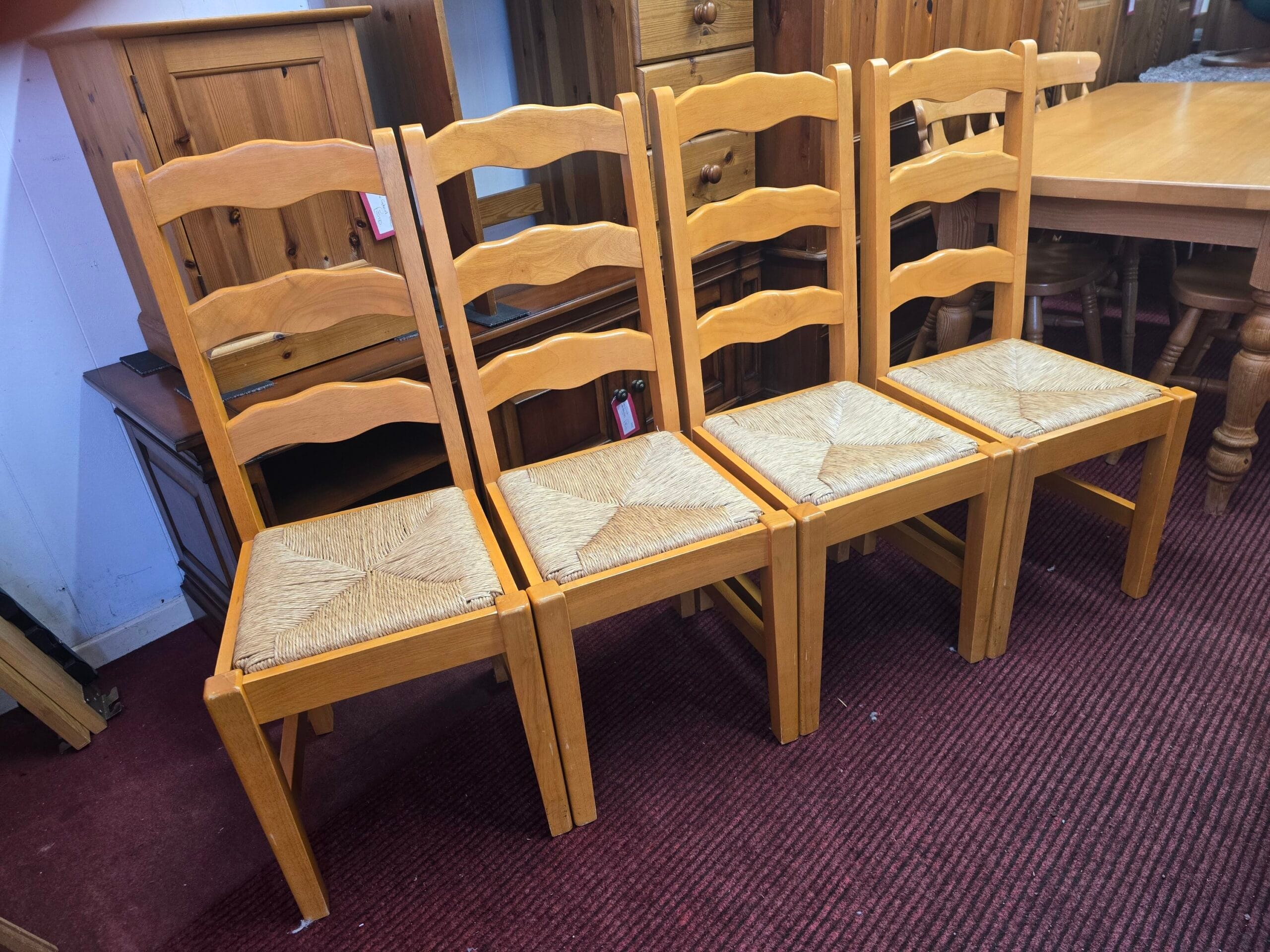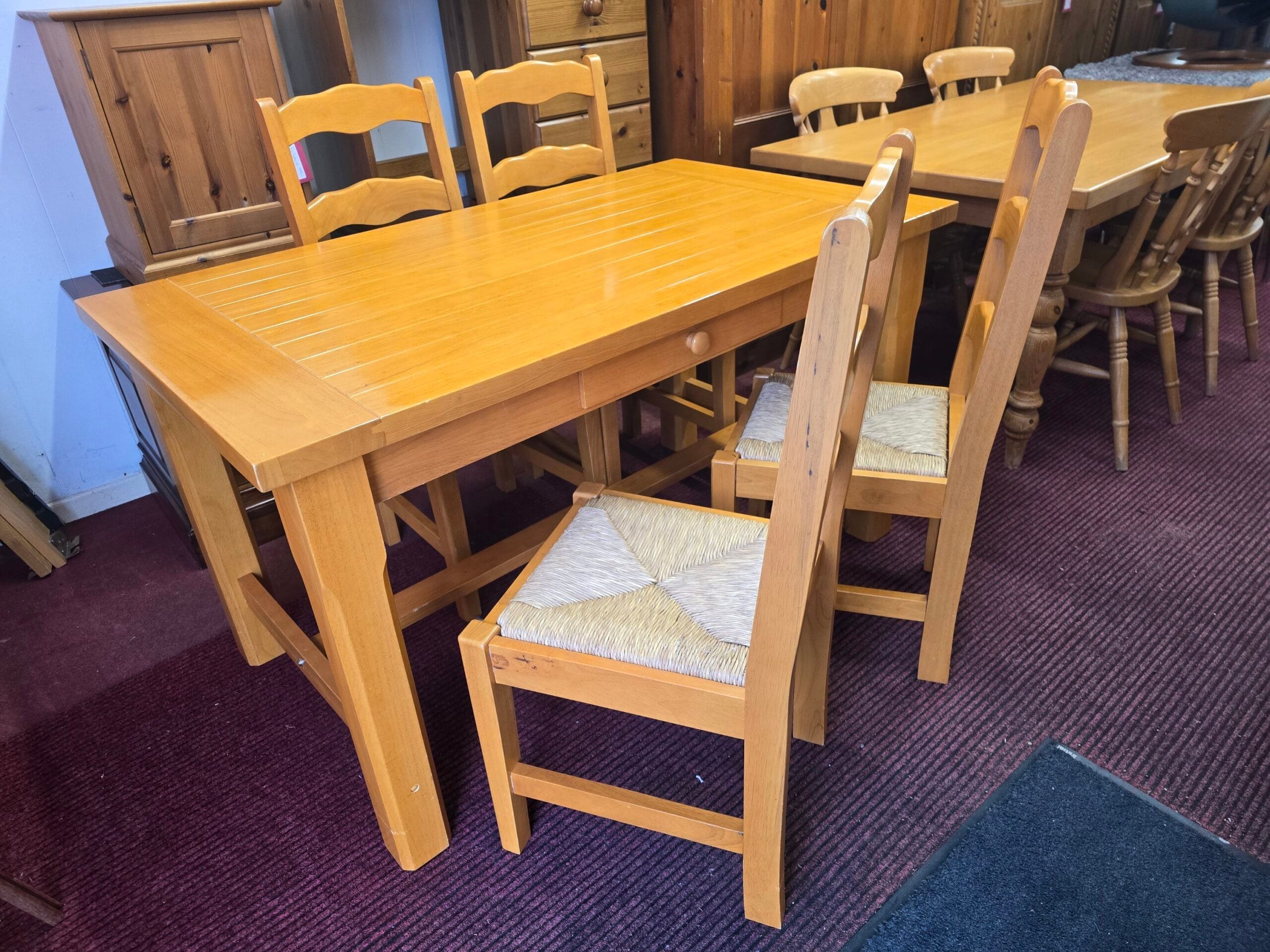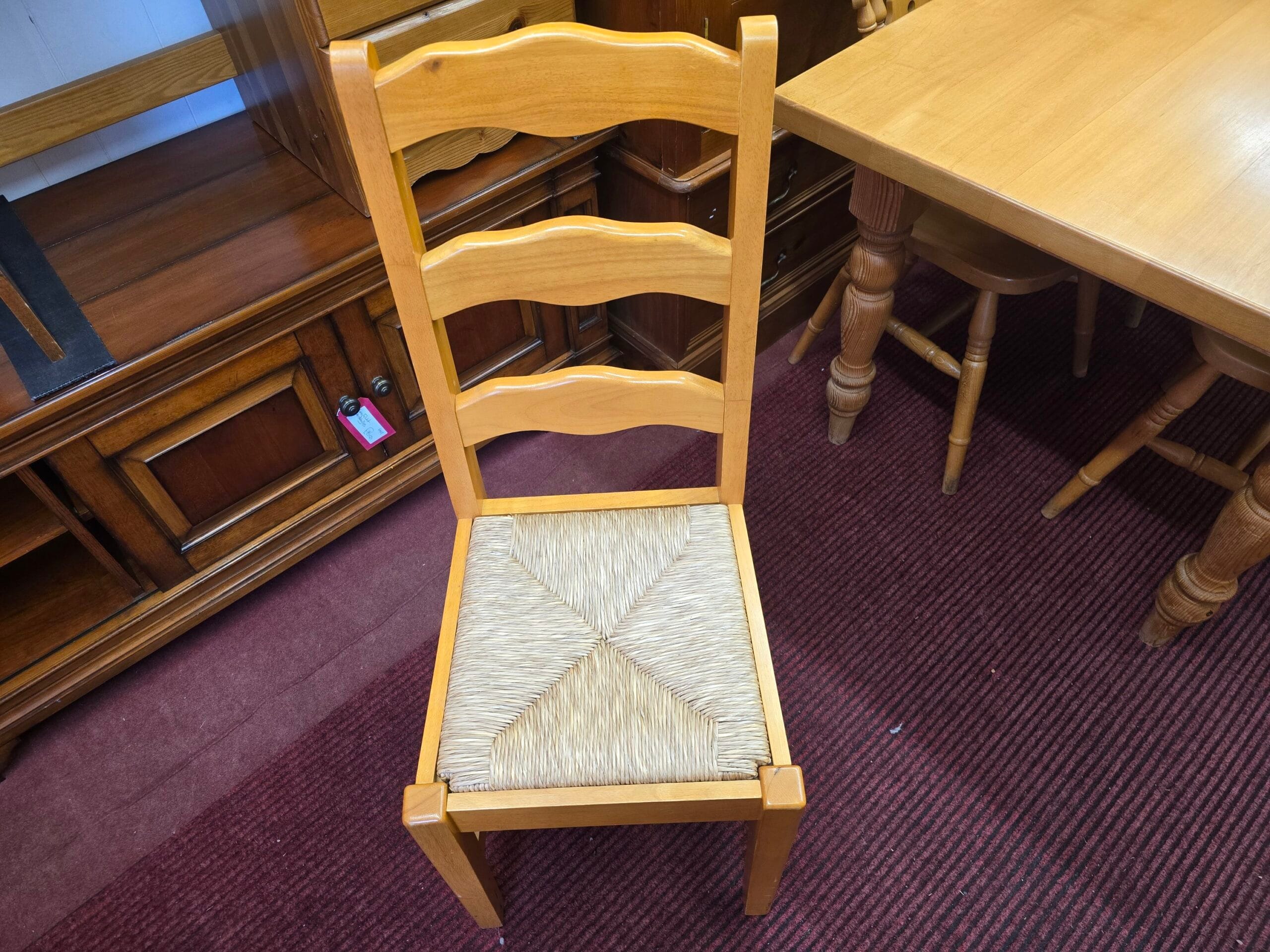 Good Quality Hardwood Table & 4 Ladderback Chairs with Rush Seats. The legs will detach from the top for transportation and ease of getting it into your home.